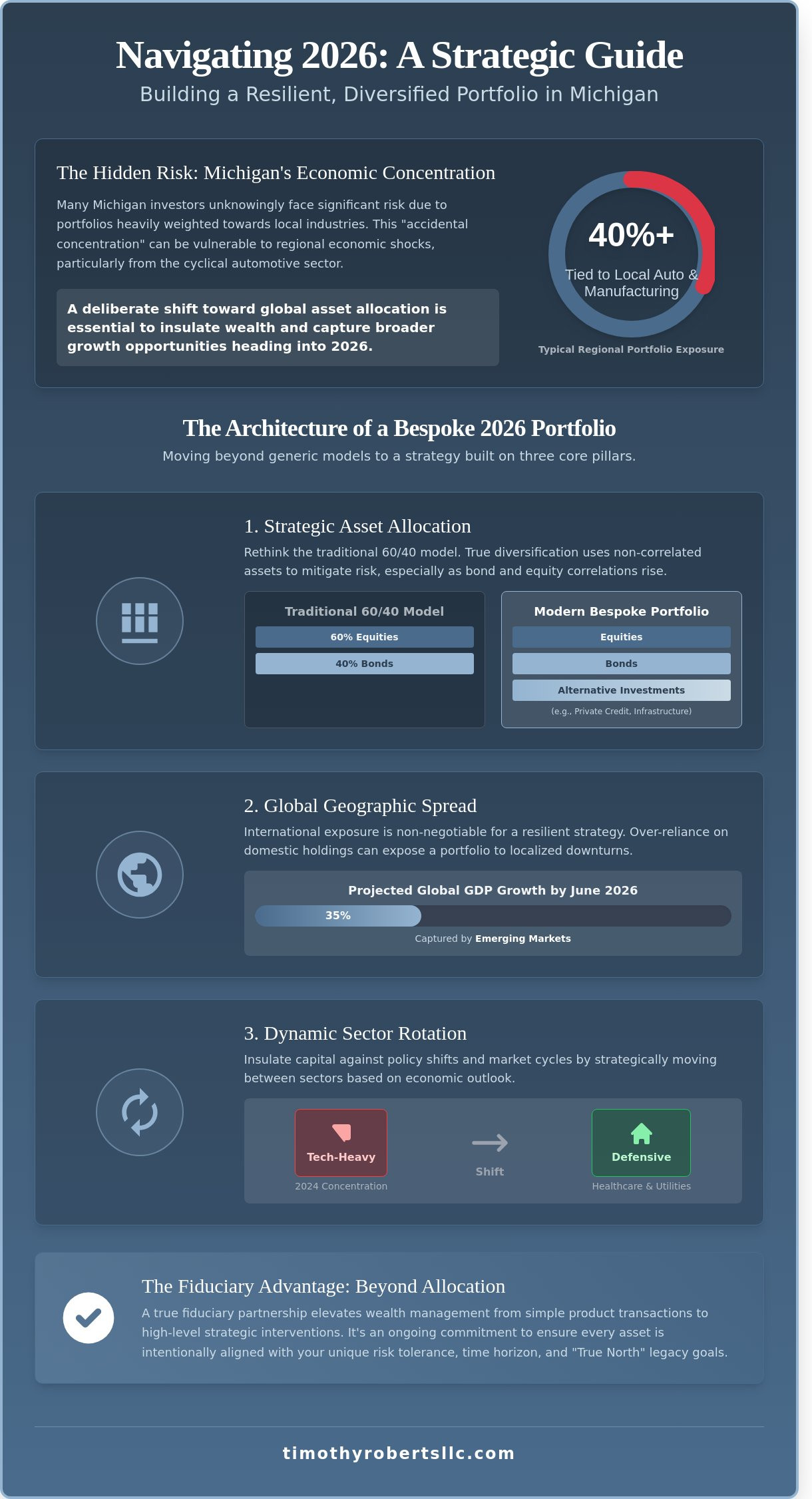 What if the very industries that built Michigan’s past are the ones quietly eroding your financial future? Many regional investors currently hold portfolios where over 40% of their total equity exposure remains tethered to the automotive sector or local manufacturing. Building a diversified portfolio in Michigan requires a deliberate shift from this accidental concentration toward a more holistic, global asset allocation. You likely understand that the projected 2026 market shifts demand a strategy far more bespoke and sophisticated than a generic, off-the-shelf model.