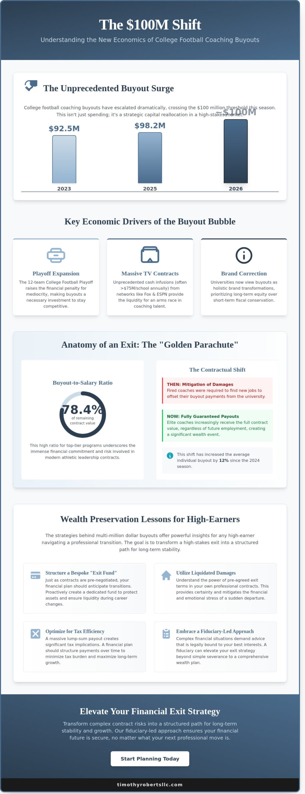 The fiscal gravity of modern sports contracts is undeniable. With college football coaching buyouts approaching $100m this season, the need for sophisticated exit strategies has never been more apparent for high-earning professionals. Timothy Roberts & Associates serves as the visionary strategist for high-net-worth clients facing these complex transitions. We don’t just manage assets; we orchestrate a comprehensive financial evolution that transforms sudden liquidity into a lasting legacy.