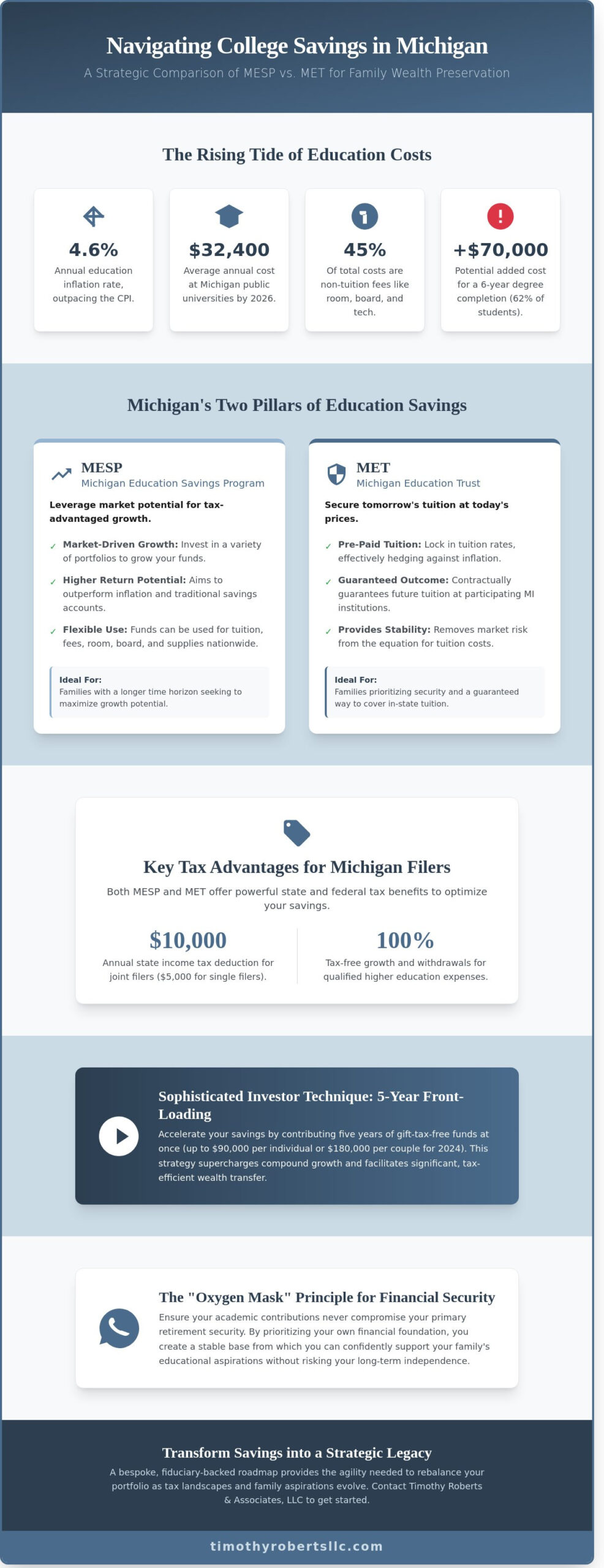 Effective education funding strategies michigan families utilize must transcend basic savings accounts. We move beyond the generic “set it and forget it” mentality. Timothy Roberts & Associates views education as a central pillar of your broader wealth elevation. It’s a strategic intervention designed to preserve capital while maximizing growth. We synthesize your family’s unique timeline with current market realities to build a plan that is as unique as your child’s future. This isn’t just about tuition; it’s about optimizing your entire financial architecture.
