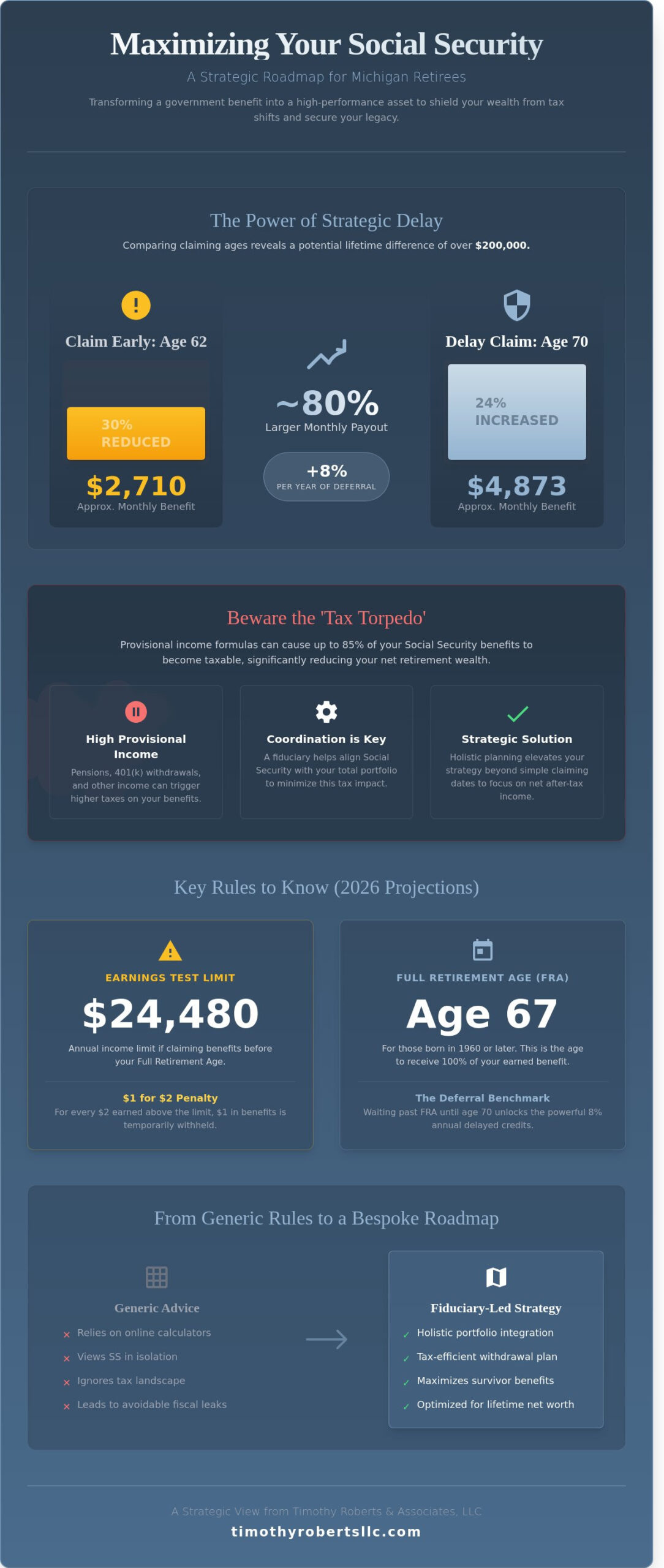 What if your Social Security check wasn’t just a monthly payment, but a high performance engine capable of shielding your wealth from the 2026 federal tax shifts? Many Michigan residents fear that claiming benefits early will leave over $100,000 on the table during their lifetime. It’s a valid concern, especially as you manage the complexities of the 2024 pension tax rollbacks and the looming federal tax torpedo. You’ve worked decades to build your legacy, and you deserve a retirement that reflects that level of dedication rather than one that’s diminished by avoidable fiscal leaks.
