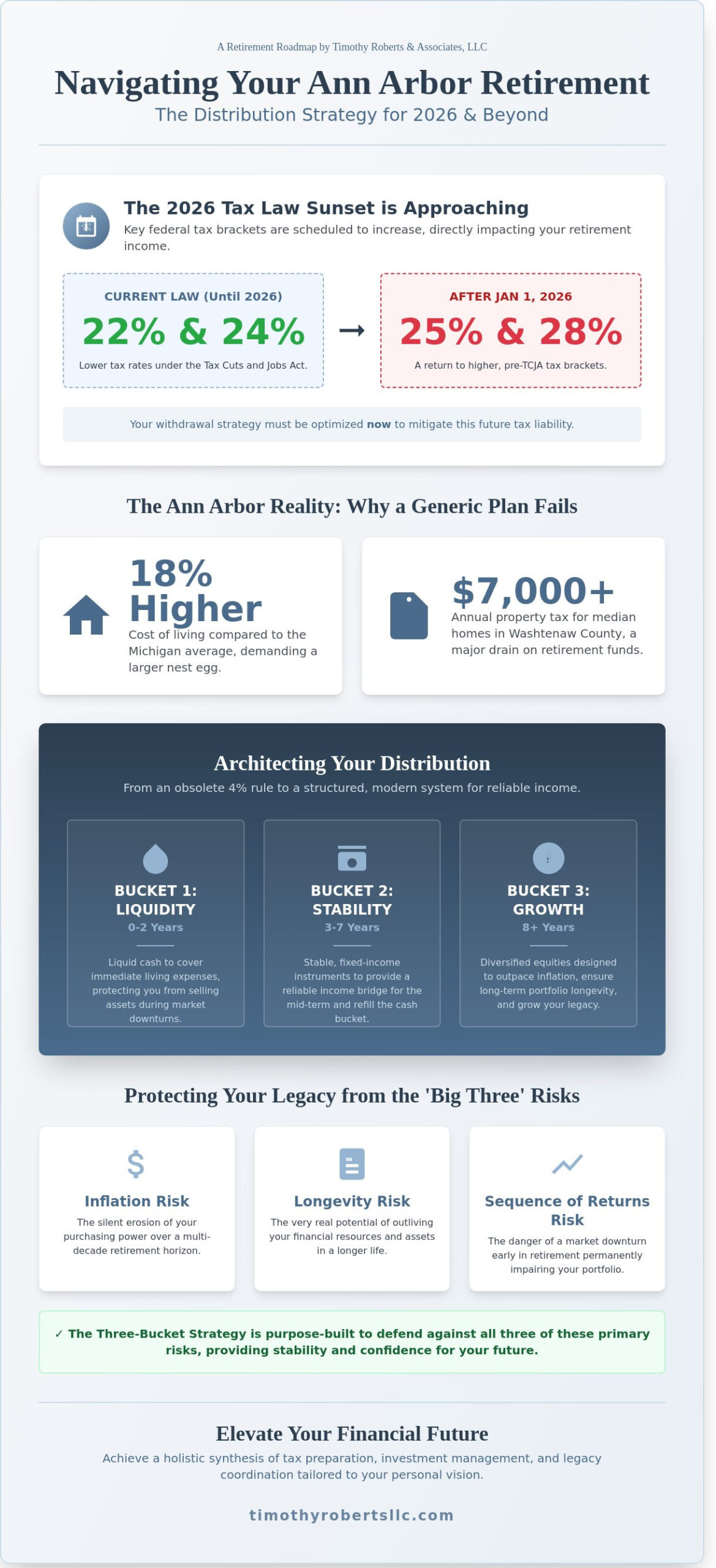 The traditional “set it and forget it” strategy for Michigan retirees is officially obsolete as we approach the January 1, 2026, sunset of the Tax Cuts and Jobs Act. For those focused on retirement income planning ann arbor, the margin for error has narrowed significantly. You’ve likely realized that accumulating wealth is a different discipline than distributing it; this is especially true when local factors like the University of Michigan’s specific 403(b) and 457(b) structures come into play. It’s natural to feel a quiet anxiety as you weigh your portfolio against the scheduled return of the 25% and 28% federal tax brackets.