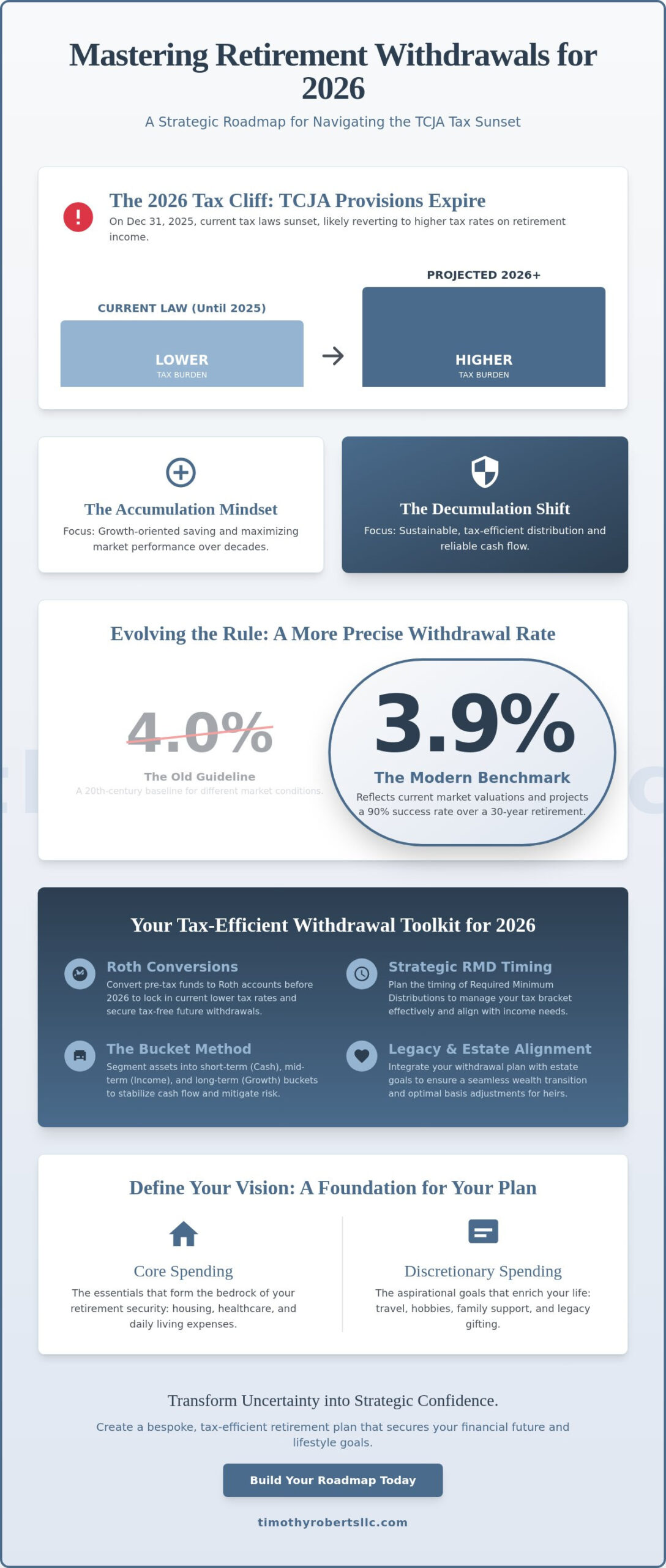 What if the very tax strategies that built your wealth become the primary obstacles to preserving it as we approach the December 31, 2025, sunset of current tax provisions? For many high-net-worth individuals, the shift from accumulation to distribution is a profound psychological hurdle. You’ve spent decades disciplined in your saving, yet the prospect of drawing down assets during a period of legislative transition creates a unique kind of friction. It’s understandable to feel uneasy about how the retirement withdrawal strategies 2026 landscape will impact your long-term security. We believe that clarity is the ultimate antidote to anxiety.